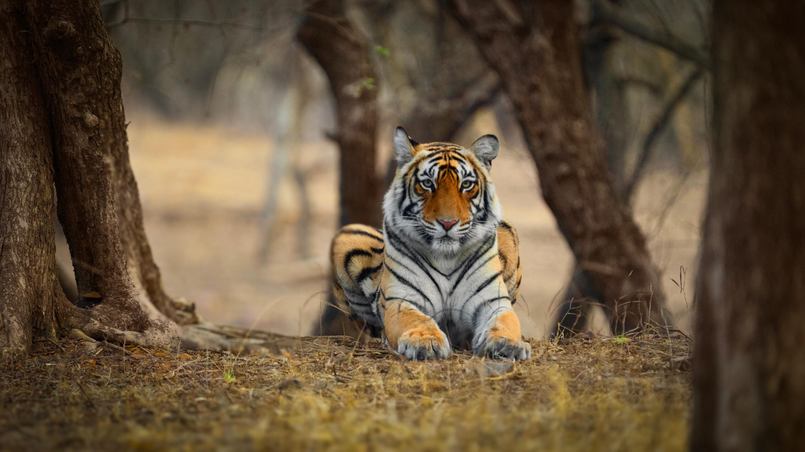 A Bengal tiger sits gracefully in the dry forest, its intense gaze locked forward as it watches its surroundings with royal composure and authority.